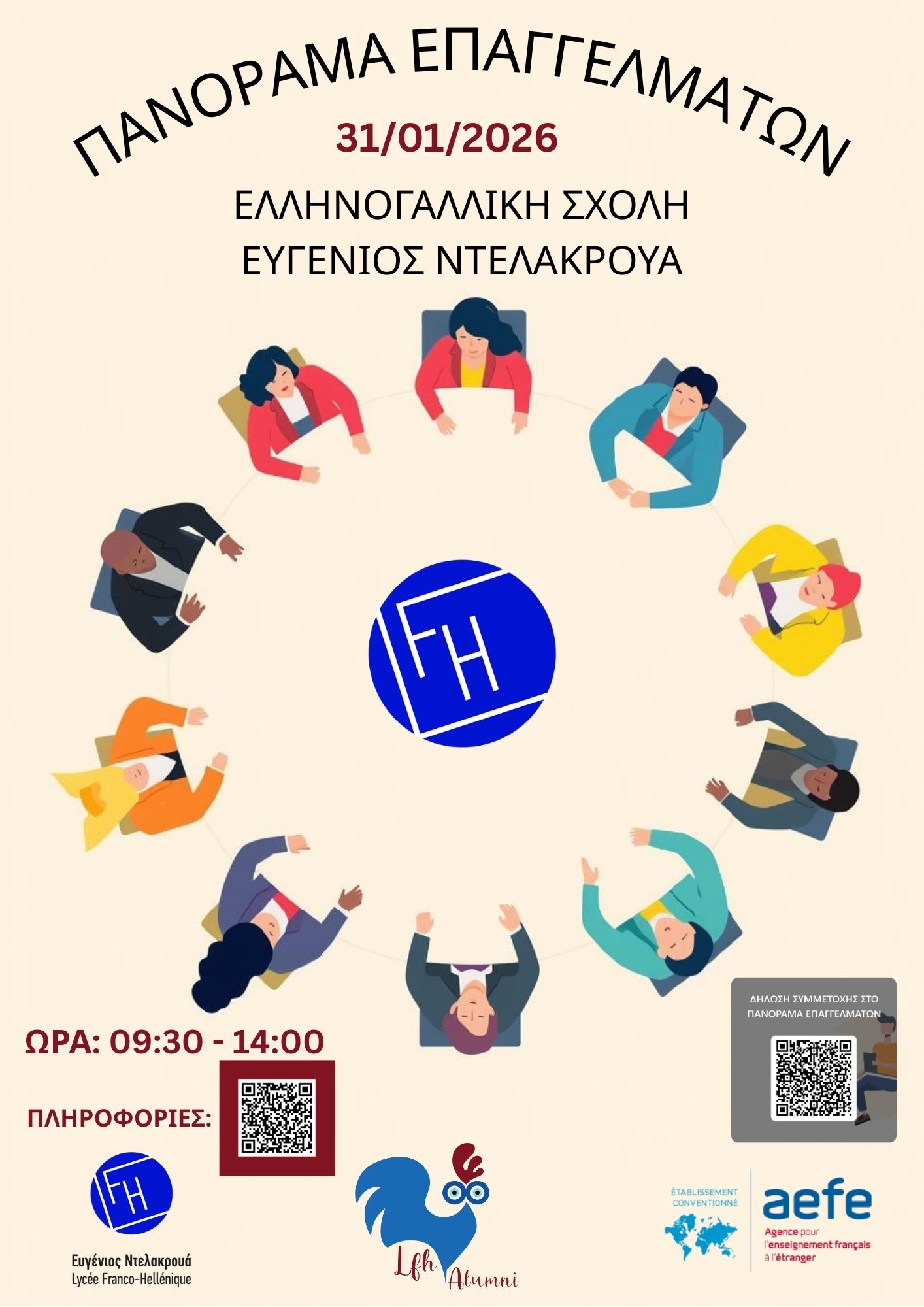 Με χαρά σας ενημερώνουμε ότι το σχολείο μας, σε συνεργασία με τον Σύλλογο Αποφοίτων Alumni LFH, διοργανώνει το Πανόραμα Επαγγελμάτων το Σάββατο 31 Ιανουαρίου 2026, ώρα 9:30 – 14:00.