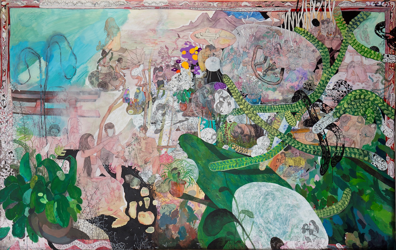 « J’ai choisi de créer deux œuvres picturales surchargées et pluralistes, à l’image des crédits de fin des films. Une multitude d’informations et de noms, devant et derrière les caméras, défilent rapidement sous nos yeux, révélant l’ampleur de chaque production. C’est là, au milieu de tout cela, que naît l’inspiration, une belle flamme qui jaillit de l’esprit des créateurs et donne naissance à une condition.